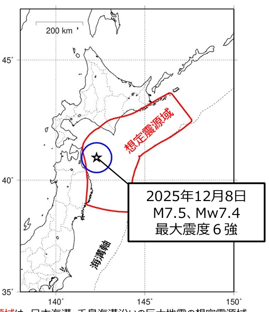 Un séisme s’est produit dans l’est de la préfecture d’Aomori à 23h15, hier 8 décembre 2025. En raison de ce séisme, la JMA évalue que le risque qu’un nouveau séisme de taille majeure frappe la zone hypothétique de l’épicentre d’un mégaséisme dans la région qui s’étend de Nemuro (à Hokkaido) au Sanriku (dans le Tohoku) a une probabilité comparativement plus importante. Si un nouveau séisme de grande ampleur devait frapper de nouveau à l’avenir, un mégatsunami pourrait survenir et les secousses pourraient être puissantes.