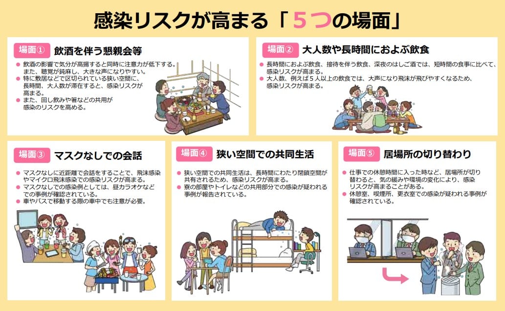 - Jusqu’à présent. nous avons affiché la liste des « 5 situations » qui augmentent le risque d’infection, mais le nombre de cas d’infection au cours de réunions avec boissons à l’appui augmente.