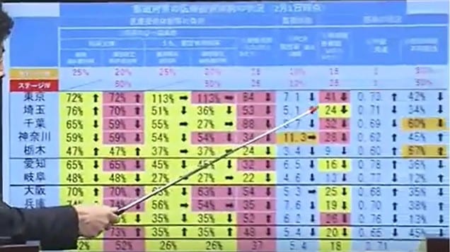(Dr. Omi) Comme le comité consultatif l’a constaté hier, le taux (de positivité) est passé sous 1, et est à 0,8. Cela change d’une préfecture à l’autre. Donc, nous n’avons aucun doute sur le fait que la progression du virus diminue. Toutefois, même si le virus perd du terrain, il faut bien comprendre la situation réelle, et les mesures à venir.